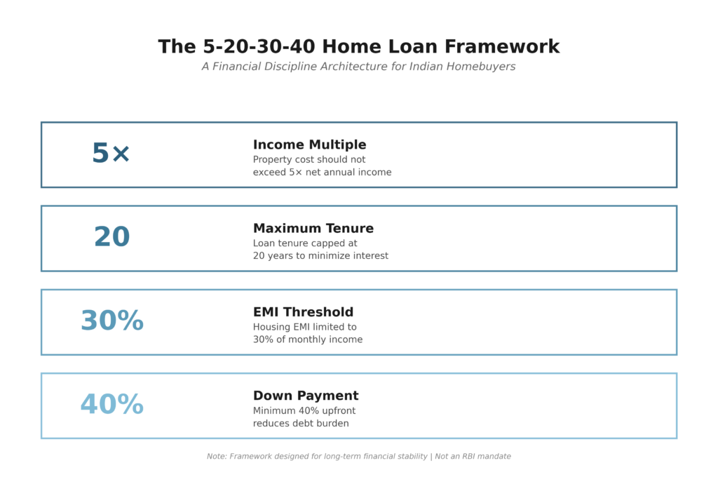 The 5-20-30-40 rule is a simple discipline framework for borrowing. It suggests buying a home priced at up to 5× your annual take-home income, keeping loan tenure within 20 years, limiting EMIs to 30% of your monthly income, and putting at least 40% as down payment. It is not an RBI rule, but a prudential guideline to avoid over-leverage.