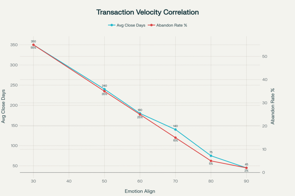 Here’s what’s remarkable: when emotional alignment exceeds 80%, average closing time drops from 300+ days to 45-75 days. Deal abandonment rates fall from 55% to 2-5%.
