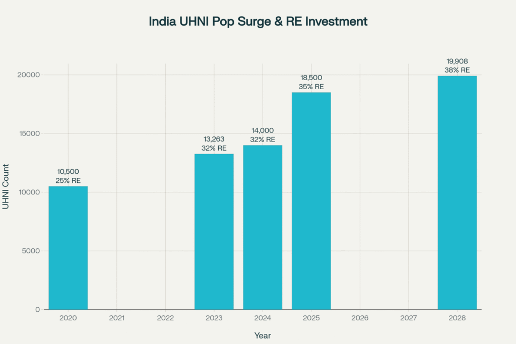 India stands at the epicenter of this wealth revolution. The country’s UHNI population reached 13,263 individuals in 2023, with projections indicating explosive growth to 19,908 by 2028—a staggering 50% increase. These investors are allocating an unprecedented 32% of their wealth to real estate, up from 25% in 2020, with this figure expected to reach 38% by 2028.