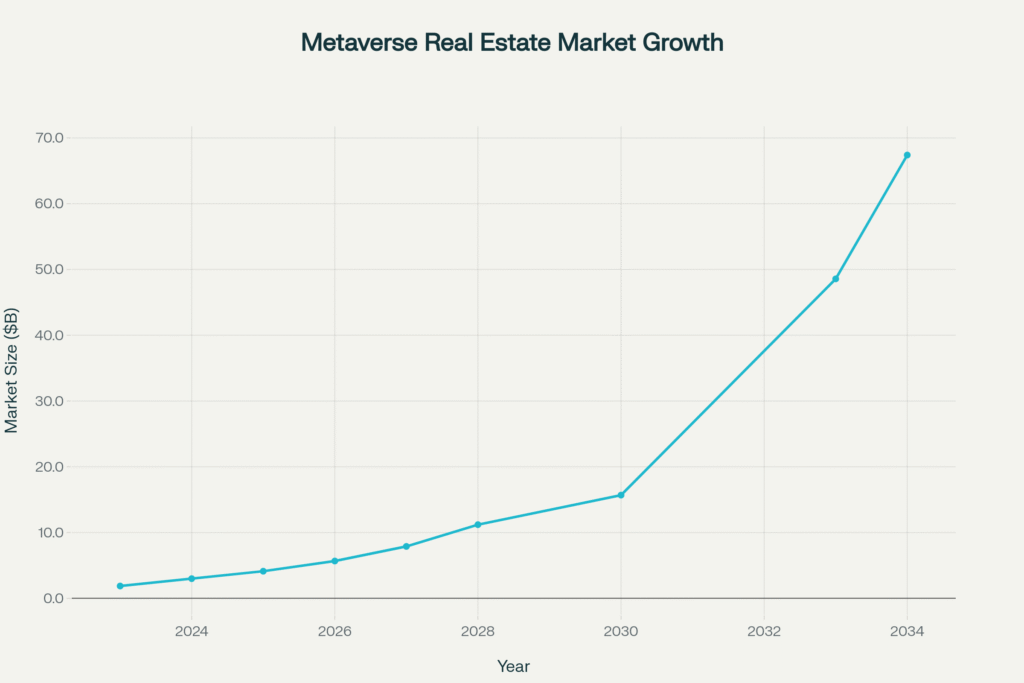 Virtual real estate markets are experiencing exponential expansion across multiple platforms and use cases. The global metaverse real estate market has grown from $1.87 billion in 2023 to $2.99 billion in 2024, with projections reaching $67.4 billion by 2034. This represents a compound annual growth rate of 36.6%, significantly outpacing traditional real estate appreciation.