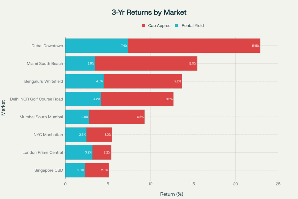 But India’s magic lies in balance—modest 3-4% yields combined with robust 5-9% appreciation create total returns of 8-13% annually, attractive without the regulatory uncertainty of pure emerging markets.