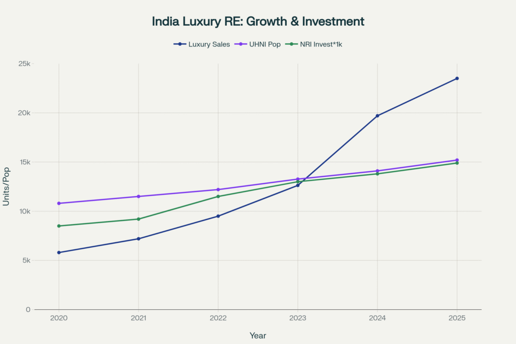 India’s luxury market isn’t just growing—it’s exploding. From 5,800 luxury units sold in 2020 to 23,500 projected for 2025, the trajectory resembles a rocket more than a real estate market.