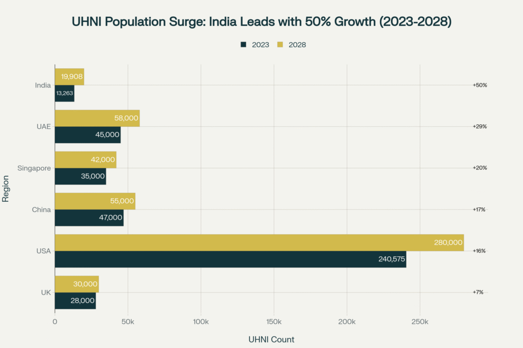 India leads global UHNI growth with 50% increase projected by 2028, from 13,263 to 19,908 individuals, outpacing USA, UAE, and other major markets