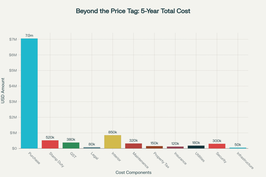 Comprehensive breakdown revealing that hidden costs constitute 29.5% of the property value over five years, with interior customization, stamp duty, and household staff representing the largest expenses beyond the purchase price