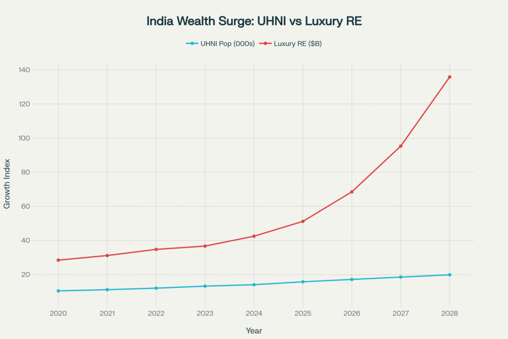 Exponential growth trajectory of India’s ultra-high-net-worth population alongside the luxury real estate market, demonstrating a projected CAGR of 33.7% (2024-2028) and validating India’s emergence as a premier global wealth hub