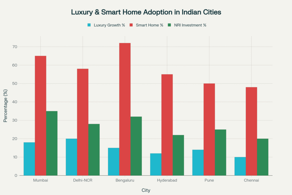Bengaluru leads India in smart home adoption with 72% penetration in the luxury real estate segment, driven by its tech-savvy population and proximity to IT corridors. Mumbai follows with 65% adoption, particularly in ultra-luxury properties (₹40 crore+), while Delhi-NCR shows 58% adoption with the highest YoY luxury sales growth at 20%.
