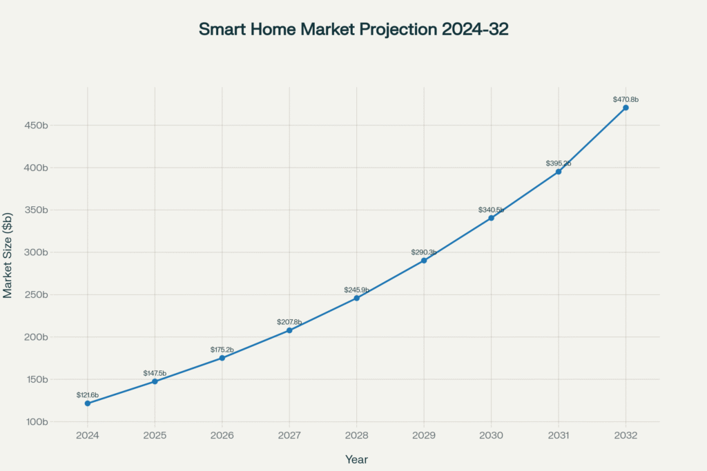 The global smart home market has transitioned from luxury novelty to institutional-grade asset class. Valued at $121.6 billion in 2024, the sector is projected to reach $470.8 billion by 2032, growing at a compound annual rate of 23.1%—substantially outpacing broader real estate appreciation.